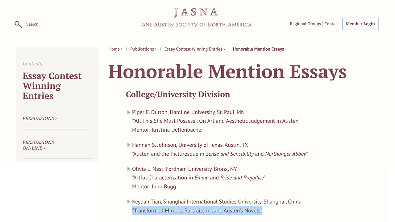 Having been listed in the collection of excellent works, Tian’s paper “Transformed Mirrors: Portraits in Jane Austen's Novels” was published on the JASNA official website. As the only China’s student on the list of the Honorable Mention, Tian said she was fortunate to get the unexpected gift.