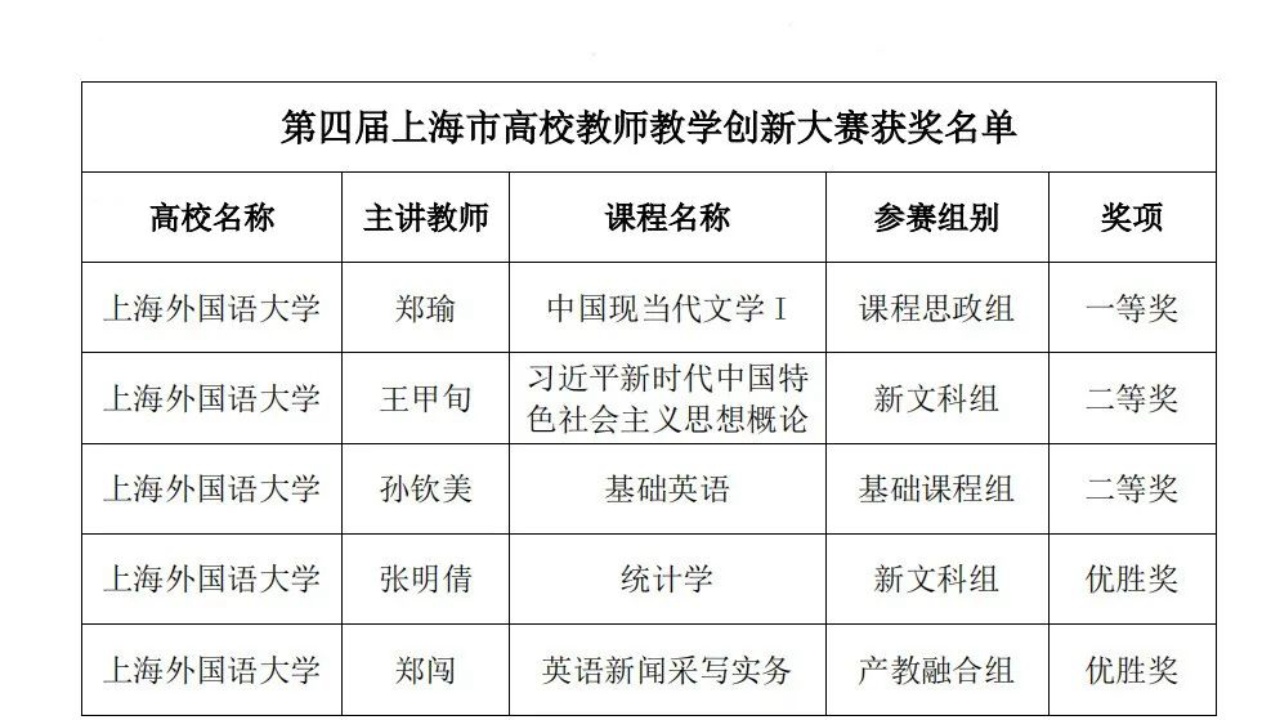 The Shanghai Municipal Education Commission announced the winners of the 4th Shanghai Teaching Innovation Contest on April 28th. Teachers from Shanghai International Studies University (SISU) were awarded one first prize, two second prizes, and two honorable mentions in total, which also made SISU a winner of the Excellent Organization Award. In this year’s competition, SISU teachers from several departments and schools, including the School of Education, the School of International Relations and Public Affairs, and the School of Communication, outperformed their rivals in the fields of political education, basic course teaching, interdisciplinary liberal arts education, and the integration of production and education, highlighting SISU’s outstanding teaching capabilities in multiple disciplines.